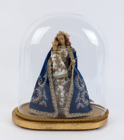 Lot Description:A large oval French glass dome containing a Virgin Mary and baby Jesus wax figure, 19th/20th century