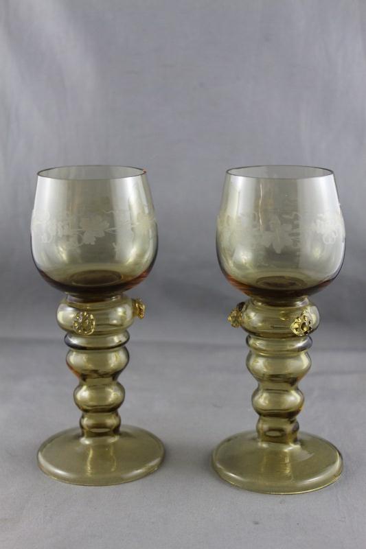 in olive green glass, with atapering annulated stems with prunt decoration, (8) -