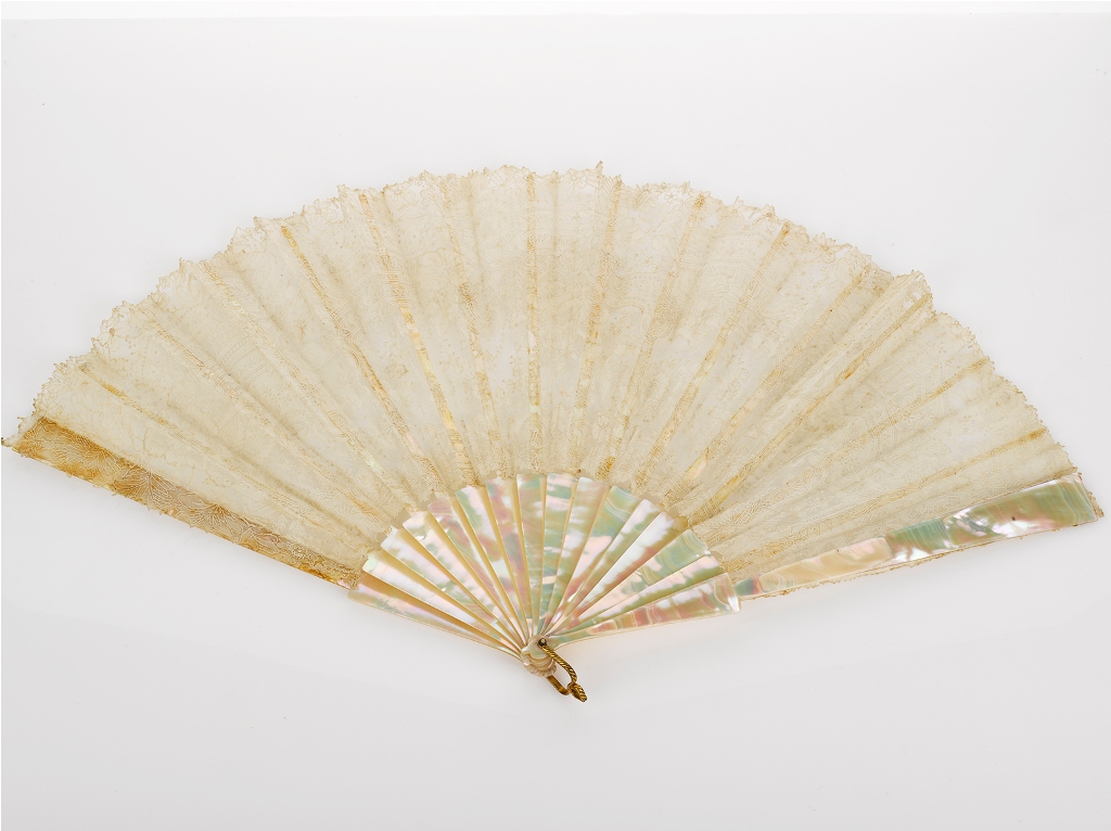mother of pearl and Brussels lace fan, plain bevelled guard sticks, complete in original box -