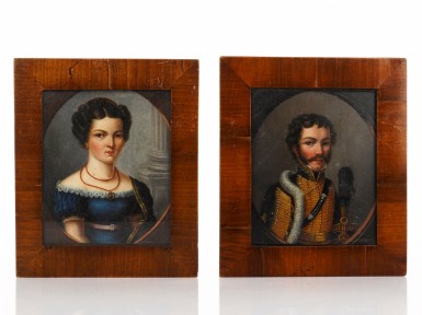 lady and officer, oil on board, walnut frames, Austrian, 19th Century
