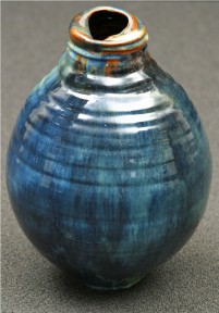 the ribbed body of globular form with elongated neck, the rim curved with slight fold, flambé glaze in shades of blue and copper, painted artist's signature to base 'Daly'