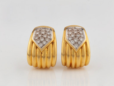 Each of tapered, ribbed design, with a pave set diamond plaque of approximately 0.75cts; 18ct yellow and white gold. Post and hinged backing. Total weight of both earrings 20.3g. -