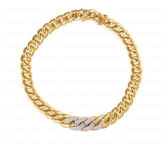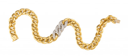 Of tapered design, central three curb links with pave set diamonds, Italian makers marks; 18ct yellow and white gold. Length 42cms. Weight 85g. -
