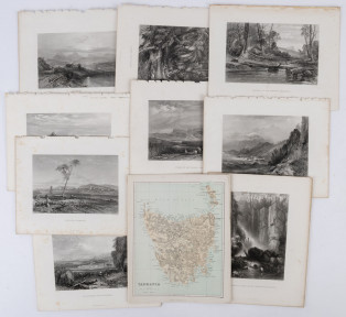 from “Australia by Edwin Carton Booth”, engraved from drawings and paintings by John Skinner Prout (1805 - 1876): comprising “Black Man’s Cove”, “Longford”, “Break of Day Plains”, “Source of the Derwent”, “Mount Wellington”, “Cataract Glen, Mount Wellington”, “The Derwent”, “Old Whaling Station” and “A Fern Tree Gully”. Also, the full page map of Tasmania by Virtue & Co., from the same volume.