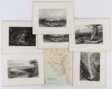 from “Australia by Edwin Carton Booth”, engraved from drawings and paintings by John Skinner Prout (1805 - 1876): subjects include”Adelaide from the River Torrens”, “Waterfall near Adelaide”, “The Burra Burra Copper Mine” and 3 others plus the full page map of South Australia by Virtue & Co., from the same volume. (7 items).