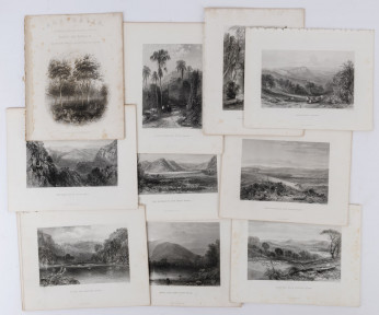 engraved from drawings and paintings by John Skinner Prout (1805 - 1876): including “Fairy Lake”, “The Hawkesbury”, Jamieson’s Valley”, “Mount Keira”, “Quarantine Burial Ground, Port Jackson” and 6 others. Also, the full title page with “Open Bush” by Armytage. (11 items).