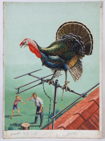 image for December edition showing a defiant Christmas Turkey after escaping the axe, 50x37cm, on board, c.1950s. -