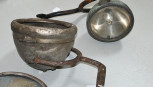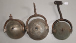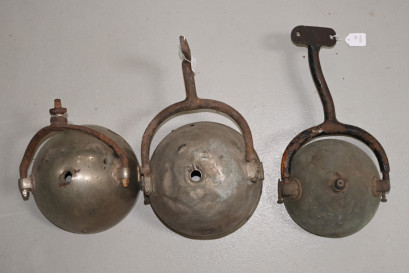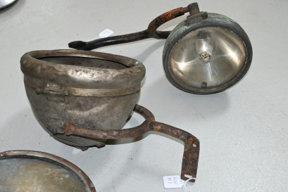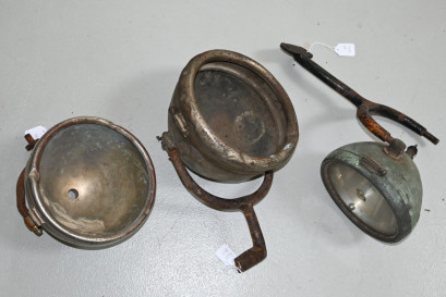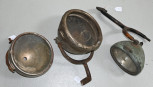 all in various conditions as photographed, flat glass of one being 17 cm diameter, one with glass stamped to hinge 'H', this bracket to large for lamp. -