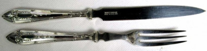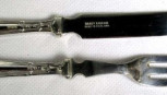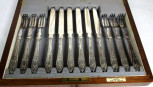 silver plate comprising six fruit/dessert knives and forks in wood case with key knives measure 19cm L -