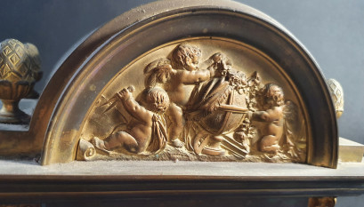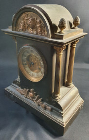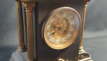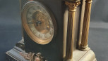 the architectural case with corinthian columns and pineapple finials, the chapter ring with recessed Arabic numerals, rasied on a rectangular plinth base with applied shield and laurel leaf plaque. Dim: 36 x 24 x 13.5 cm. -