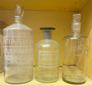 Lot Description:Three Clear Glass Apothecary Bottles with Etched Labels