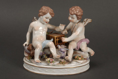 in the form of two putti, seated next to a birdcage, in tones of pink, brown and blue, mark to base, height 11.5cm -