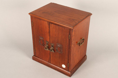 of rectangular form, with twin doors opening to reveal multiple drawers and open compartments, the doors engraved with European style coronet, with brass hardware, 36cm x 31cm x 23cm -