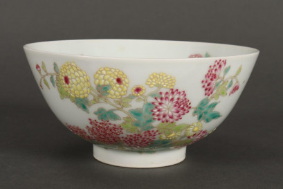 of conventional form, the interior decorated minimally with assorted branches and fruits, the exterior with bright Chrysanthemums sprays, in predominant pink, yellow and green enamel tones on a white ground with gilt line accenting, height 7cm x diameter 14.5cm -