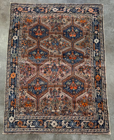 Lot Description:A Turkish geometric pattern rug with a beige ground and blue borders