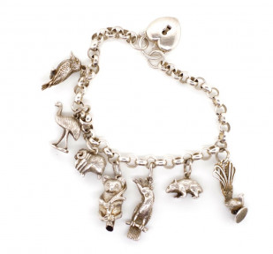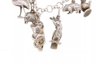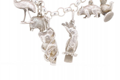 includes cast kookaburra, , emu, ram, koala (reg no. 38755 sil makers), cockatoo, wombat, lyre bird charms. Approx belcher width 5.3mm, length 16cm, weight 47 grams -