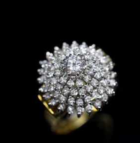marked 18ct. With a stepped conical setting. Approx total weight of diamonds 1.00ct, mixed cuts includes round brilliant, single and Old European cuts, ring size O, item weight. D426 -