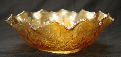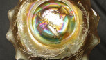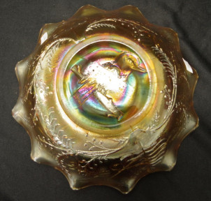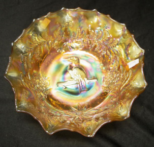 Lot Description:Marigold Carnival glass "Kookaburra" master bowl