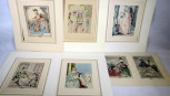 includes two erotic ltd edition prints lady playing the cello 691/2000 and a partly clad woman holding flowers 1816/3000 together with two Venetian Carnivale prints etc largest measures 23.8cm H x 17.5cm W plate size all unframed (7)