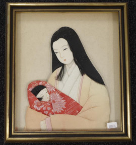 depicting a Mother with Infant, composed of applied traditional silk fabrics on board, (25cm X 21cm approx). -