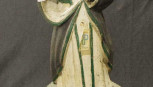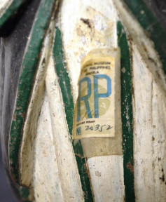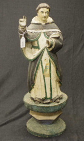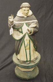 figure of a Standing Preacher, (1 carved hand missing), on carved stand, with affixed stamp of the National Museum of the Philippines, Manila, (height 49cm approx, total including base). -