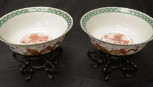 each with painted dragon decoration, marked to bases, on wood stands, (diameter 18cm approx, each bowl). -