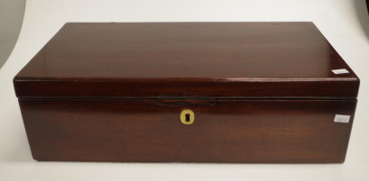 with dual brass handles to side, lid opening to fitted interior with leather faced writing surface, 1 original glass inkwell, (cover unavailable), and 1 drawer to side, (key unavailable), (length 46cm; height 14cm approx). -