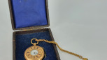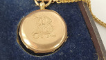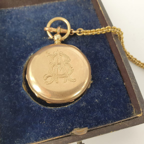 blue enamel Roman numerals on case (some missing). Glass insert missing from front case. Includes watch chain, with 9ct rose gold clasp and tassle charm, and gold-plated chain. No key. Diameter 34mm. Weight (all in) 40.8g. -