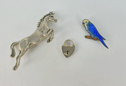 signed 'Tonie Taylor', Birmingham, George Tarrett, 1967. Together with silver and enamel Budgerigar brooch and sterling silver locket. Weigh (all in) 12.4g. (3) -