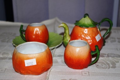 Lot #1238 - European strawberry form tea pot, cups & sugar