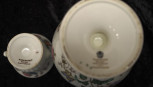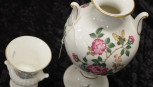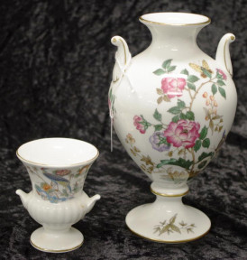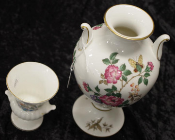 dual handles, blossom decorated, marked to base, (height 21cm approx); together with a Wedgwood '' Kutani Crane,' posy vase, (height 9cm approx). -