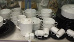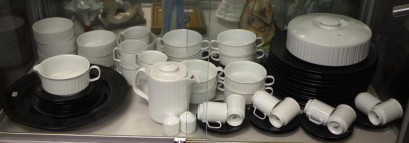 'Variation' pattern, marked to bases for 'Studio-Linie: Porcelaine Noir,' designed by Tapio Wirkkala, including: 12 black dinner plates, 6 white soup coupes, with black under saucers, 7 white dessert bowls, 5 white teacups with black saucers, 8 white coffee cups with black saucers, white lidded serving bowl, a black serving bowl, a cream jug, pair white salt shakers, and a tea pot. -