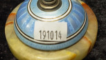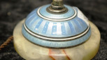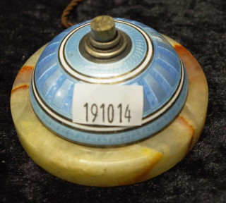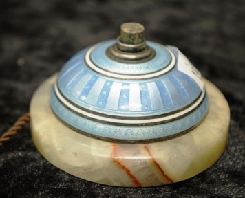 London Import Marks circa 1909, marked for Erich Kellerman,, blue guilloche enamel to top, (small chip), with jasper button piece, and onyx base. (Bell sound action requires repair). -
