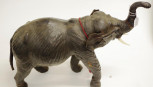 with trunk raised, and 2 bone tusks, (height 37cm; length 50cm approx). -