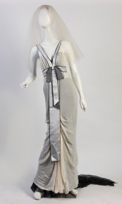 a chiffon, satin and silk black and white empire line dress with sweetheart neckline, together with a elbow length veil