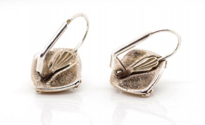 with applied bead work and lever backs, unmarked. Approx setting width 14.5 x 14.5mm -