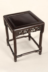 with square top, set above a carved apron and four legs on ball feet, united by stretchers, height 21cm and width 16cm -