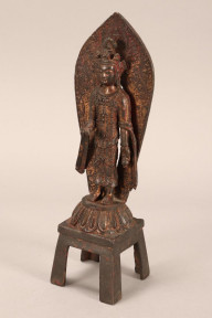 Buddha depicted standing up with one hand out and the other holding vase standing on pedestal, on a four leg stand, with engraved background, height 26cm -