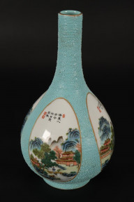 of pear form with a slender cylindrical neck, the body decorated with four equally spaced ovoid reserves containing landscape scenes below inscriptions, bordered by gilt accenting, set against an unusual dimpled blue glaze ground, mark to base, height 28cm -