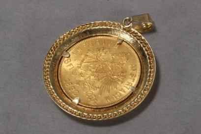 .900 purity, 8 Florins/ 20 Francs, set within a 14ct marked rope twist circular mount with bail, total weight 8.81gm -