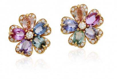 Each designed as a flower head centring a brilliant-cut diamond stamen within a surround of petals claw-set with oval-shaped multi-coloured sapphires together weighing approximately 15.00 carats framed by pavé-set diamonds.