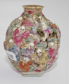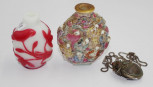 to include figural ceramic bottle, character marks to base, 7cm height approx, white glass bottle with floral overlay, together with a pendant snuff bottle -