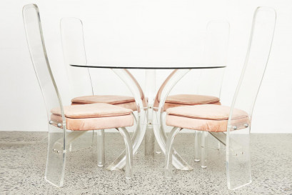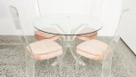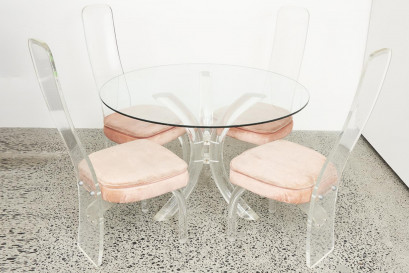 comprising four lucite high-back chairs with pink velvet upholstered seats, and a table with circular glass top and lucite base (4)