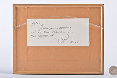 A framed and glazed print, approx. 30cm x 24cm, of the Porsche Cayenne, by Stephen Mukett, chief exterior designer of the Cayenne. Personal inscription to rear to Michael Barker, dated March 2002. -