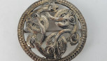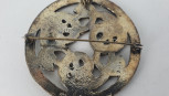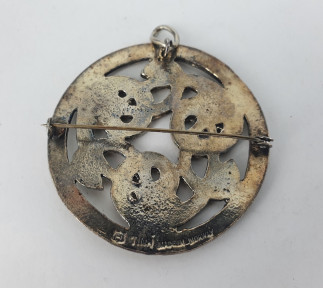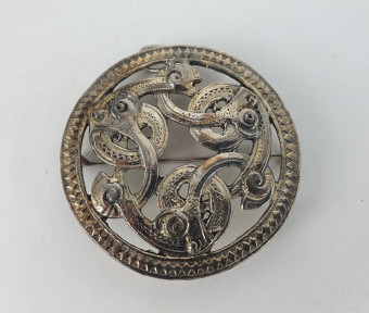 circular brooch with geometric interweavin design thought to be Celtci serpants. Marked 'Makde in Norway' and signed 'H. Tinn'. Diameter 60mm. -