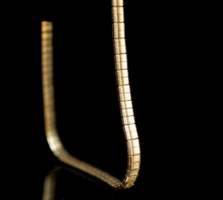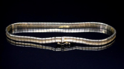 marked 9k. With Omega type Approx length 21cm, width 4mm, weight 11.5 grams -