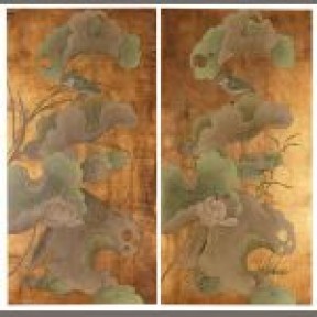 with a gold ground within a black border. 20th century A palette of green hues with kingfishers sitting on large lotus leaves. painted on board. [2] H91cm x W50.7cm -