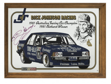 Lot Description:FORD: A circa 1981 signed framed mirror commemorating Dick Johnson Racing winning the Bathurst