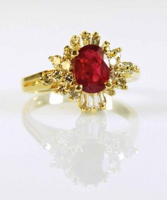 With an oval cut ruby surrounded by Round brilliant and baguette cut diamonds 9ct yellow gold (tested) -