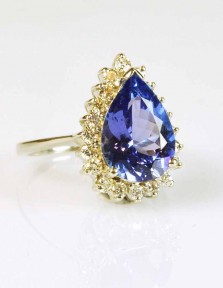 The pear cut tanzanite measures 12.5 x 9mm and is surrounded by 20 round brilliant diamonds -